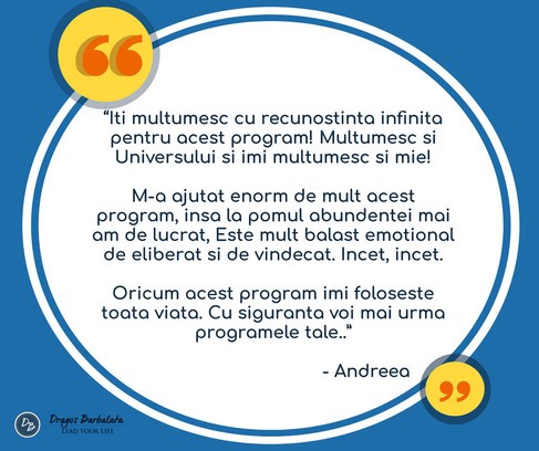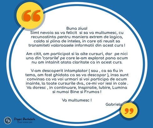 “Am participat la foarte multe seminarii și in majoritatea am auzit aceleași lucuri. Citesc foarte mult, cunosc multe despre dezvoltarea personală, dar acest seminar chiar mi-a atras atenția și m-a mobilizat prin structura logică și abordarea relaxantă.“