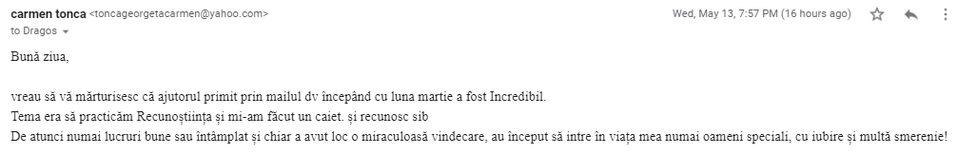 Asa ca, iti propunem sa incepem un JOC al practicarii Recunostintei fata de aspectele importante ale vietii noastre (sanatate, relatii, bani, munca, etc.), prin invatarea si aplicarea unor tehnici.
